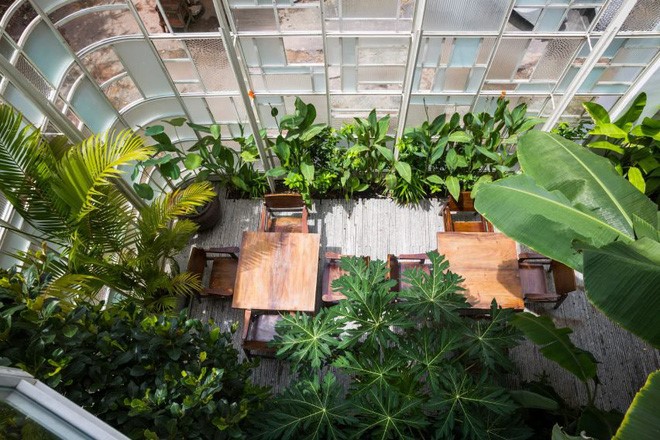 Mọi chỗ ngồi trong nhà hàng đều có thể nhìn thấy khu vườn xanh mát đan xen với các vách kính trong mờ lạ mắt.