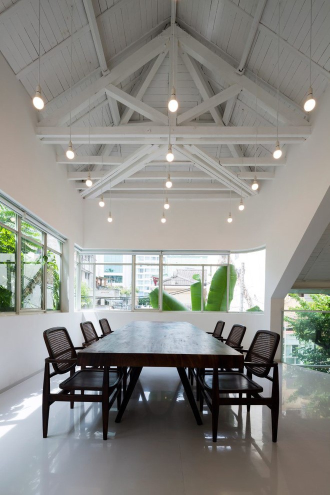 Ngoài tầng một được thiết kế là nhà hàng, từ một nửa tầng hai và tầng gác mái là không gian sinh hoạt của gia đình. Hầu hết đều được sơn màu trắng để tạo cảm giác sang trọng, hiện đại, rộng rãi và thoáng đãng.