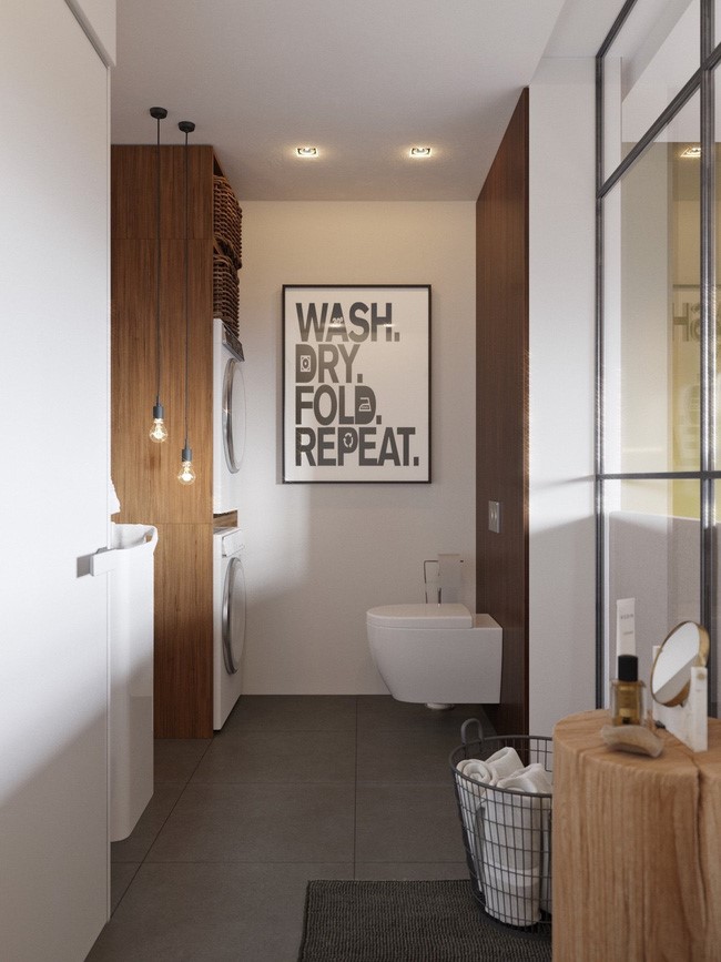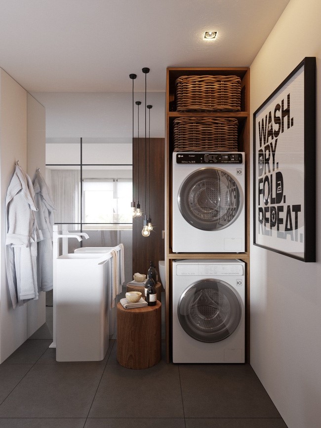 Những món đồ nội thất hiện đại nhỏ gọn và kệ máy giặt, máy giặt bố trí hợp lý giúp căn phòng này dù không lớn những vẫn thoáng mắt.