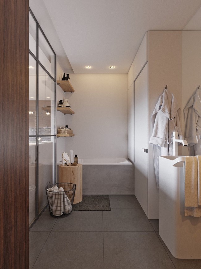 Phòng tắm - giặt được bố trí trong cùng một không gian và cũng xinh không kém.