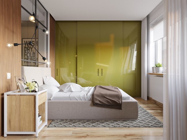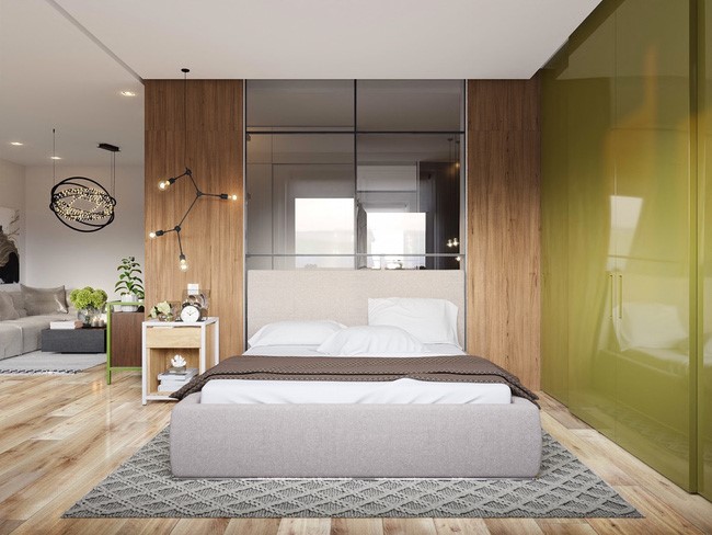 Phòng ngủ thoạt nhìn vô cùng đơn giản nhưng lại rất hút mắt với tủ đồ đồng màu với tủ lạnh và bức tường gương giúp không gian thêm thoáng, rộng.