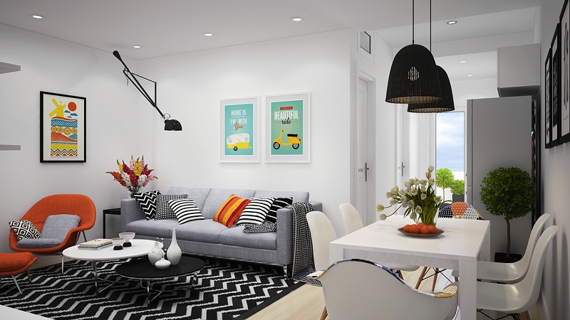 Tuy nhiên, với những không gian căn hộ nhỏ, diện tích khiêm tốn, bạn nên sử dụng tông màu sáng như màu trắng, màu kem, màu vàng nhạt… để làm cho căn hộ trở nên thoáng hơn và rộng hơn. Bạn có thể tạo thêm một vài điểm nhấn như đèn chùm, tranh treo tường… để làm điểm nhấn cho căn phòng bớt nhàm chán và đơn điệu.